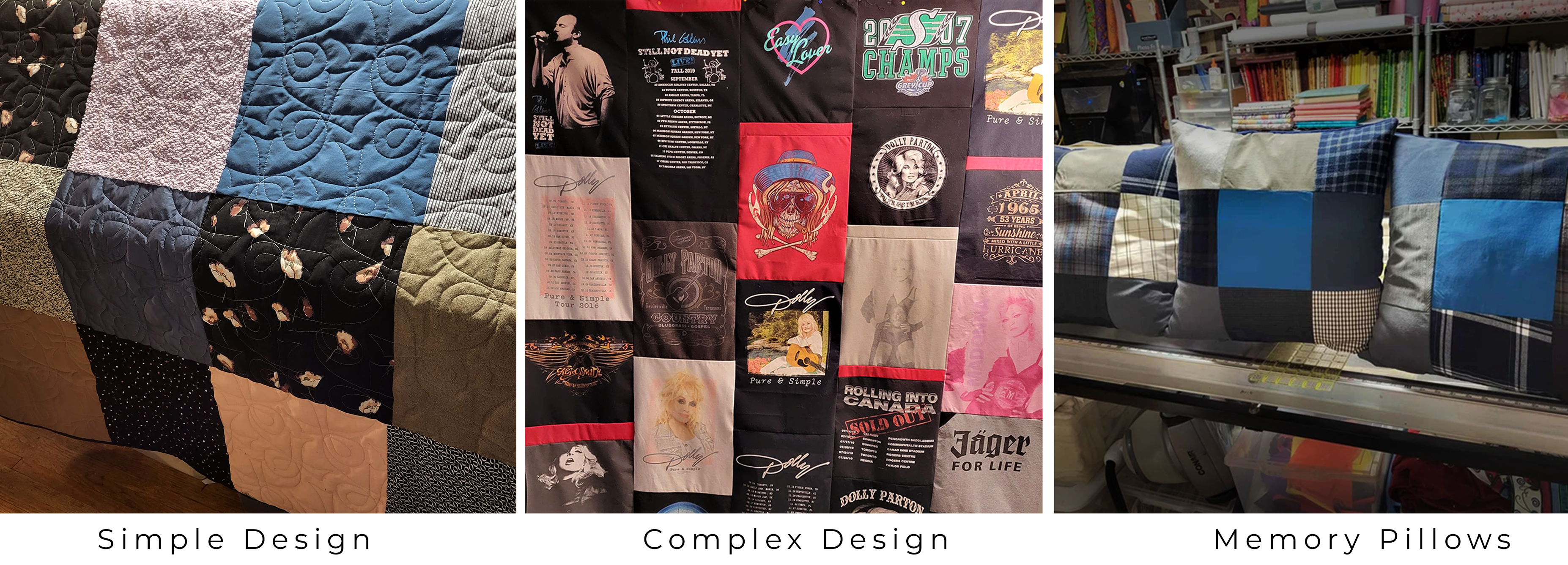 Besides the cost of traditional 3-layer quilting, the majority of the cost for a memory quilt comes from labour and technical skill. It is time-consuming to cut the source fabrics, and even then before sewing can begin they must be arranged which is a complex process and may even require a custom pattern.