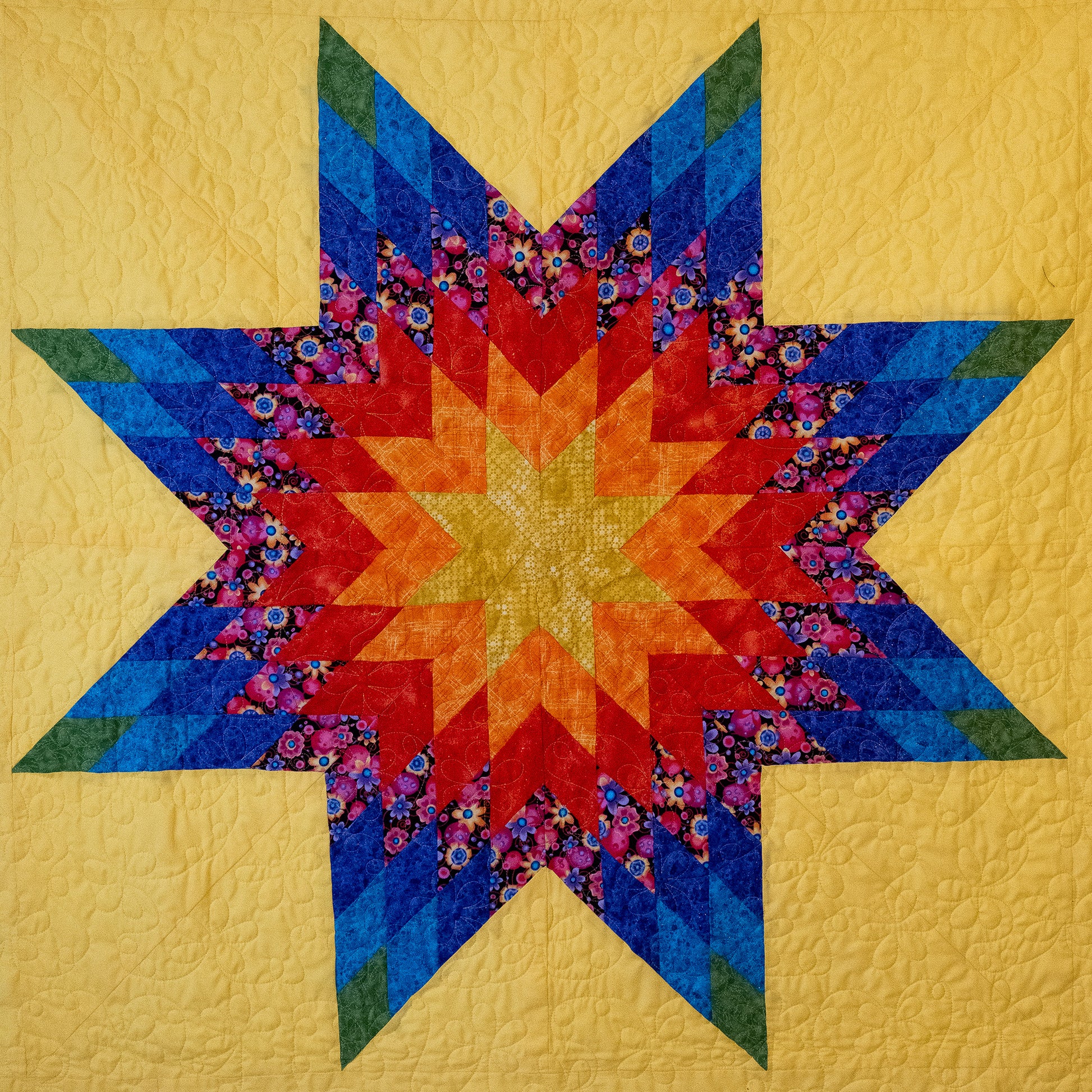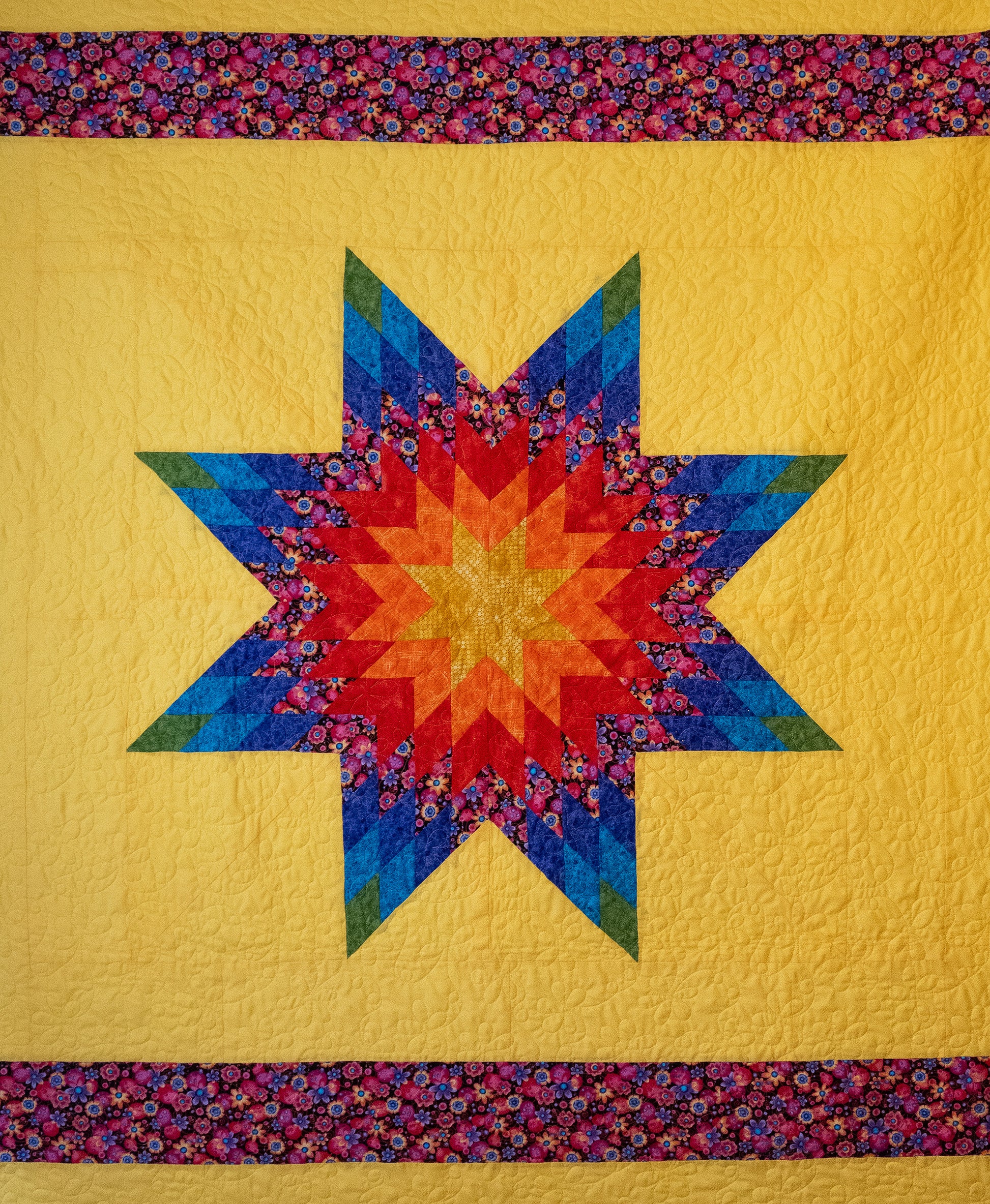 Beautiful rainbow star design set against a sunshine yellow background. Crafted of premium 100% cotton top, back, and batting. This throw size measures 69" by 58". This lovely throw is quilted with a cheerful daisy pattern.
